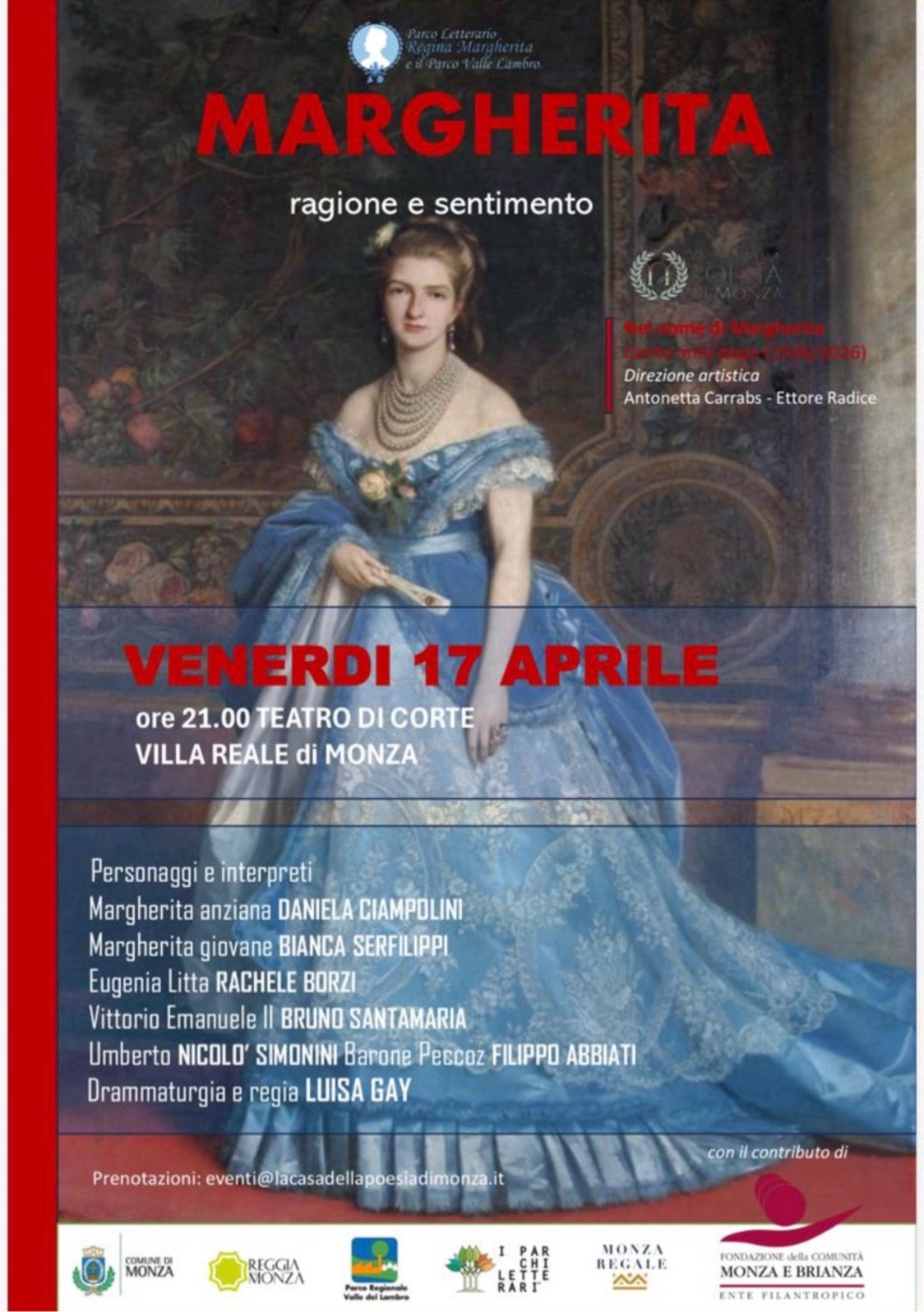 Margherita di Savoia, Regina madre, rammenta la sua vita fatta di luci e di ombre, non solo quella tragica dell’uccisione di Re Umberto. Colta, non solo bella, più lucida e spregiudicata di quanto la narrazione ufficiale recitasse. Non perse mai l’equilibrio tra i doveri del suo ruolo, le sue passioni…e, gli inevitabili gossip sul suo matrimonio Nella drammaturgia monologhi e dialoghi si alternano come in un’opera lirica. Cinque attori agiscono: una Margherita anziana, una Margherita giovane/ adulta, un Vittorio Emanuele II preoccupato del suo regno appena formato, un Umberto pensoso, una bellissima Eugenia Litta, e il cortese barone Peccoz, fedele amico di Margherita. Con Daniela Ciampolini, Margherita anziana; Bianca Serfilippi, Margherita giovane; Rachele Borzi, Eugenia Litta; Bruno Santamaria, Vittorio Emanuele II; Umberto Nicolò Simonini; Filippo Abbiati Barone Peccoz.
